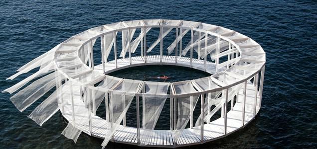 木造的結(jié)構(gòu)體創(chuàng)造了一個(gè)分隔的空間,外脫離于無垠大海的廣闊天地,內(nèi)圍合出一塊小水池。它是永無止境的柱廊,不朽的環(huán)形廟宇,意圖要游離在時(shí)間的概念之外。宛如漂浮在藍(lán)天上的白色云朵,它是漂浮在碧藍(lán)大海上的白色空間。因漂浮不定而顯得輕盈優(yōu)雅。