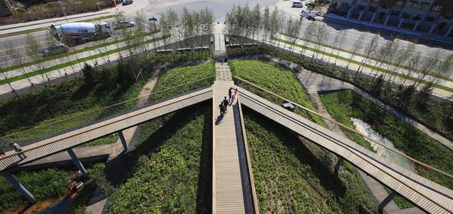該公園保留場地中部的大部分區(qū)域作為自然演替區(qū),沿四周通過挖填方的平衡技術(shù),創(chuàng)造出一系列深淺不一的水坑和高地不一的土丘,成為一條藍(lán)-綠項(xiàng)鏈,形成自然與城市之間的一層過濾膜和體驗(yàn)界面。沿四周布置雨水進(jìn)水管,收集城市雨水,使其經(jīng)過水泡系統(tǒng)經(jīng)沉淀和過濾后進(jìn)入核心區(qū)的自然濕地,山丘上密植白樺林,水泡中為鄉(xiāng)土水生和濕生植物群落。高架棧橋連接山丘,布道網(wǎng)絡(luò)穿越于丘林。水泡中設(shè)臨水平臺(tái),丘林上有光觀亭塔之類。這樣創(chuàng)造出豐富多樣的體驗(yàn)空間。