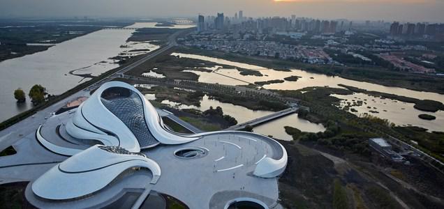 該建筑由一大一小2個(gè)音樂廳以及一個(gè)偌大的公共空間組成,3個(gè)主要空間通過一個(gè)“絲帶”似的建筑屋頂連接在一起,露出來的部分鋼結(jié)構(gòu)玻璃幕墻屋頂仿佛絲帶包裹住的一顆寶石,閃爍在松花江畔,由MAD(馬巖松工作室)完成。