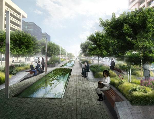 綠色基礎(chǔ)設(shè)施與綠色街道和綠道成比例,用作肥沃的區(qū)域,生長一些本土產(chǎn)品、輸送水源。設(shè)計(jì)師將一條6車道、瀝青高速改造成一條綠道,供自行車、行人和農(nóng)業(yè)生產(chǎn)使用。從雨水和其他來源中收集的有機(jī)廢水,經(jīng)過處理再利用,供給社區(qū),減少70%的市區(qū)可飲用水使用量。