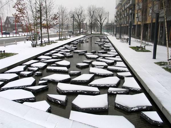 該項(xiàng)目完工于2013年,包括一個(gè)雨水廣場(chǎng),將雨水存儲(chǔ)與城市公共區(qū)域的投資結(jié)合起來。設(shè)計(jì)師決定水元素必須是“可見的”,同時(shí)要穿過廣場(chǎng)。