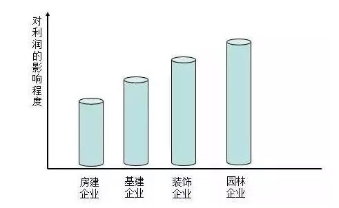 “營改增”顧名思義就是對以前繳納營業稅的應稅項目改成繳納增值稅?!盃I改增”對建筑業不同子行業及同一子行業內不同企業的稅負、利潤指標有不同的影響,關鍵在于增值稅進項稅可抵扣比例不一樣。那么“營改增”對建筑細分行業的影響有什么不同?我們大致將建筑細分行業分為四個:房屋建筑、基建、裝飾、園林。下圖是四個行業的企業利潤所受到的影響程度: