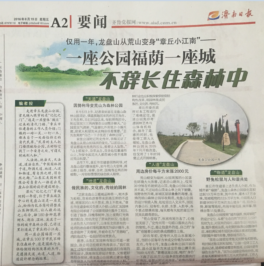匯友市政園林集團有限公司承接的章丘龍盤山森林公園項目于7月份正式開園納客,得到了章丘市委局、業主以及周邊市民的一致好評,并引來多方媒體前來宣傳報道道。