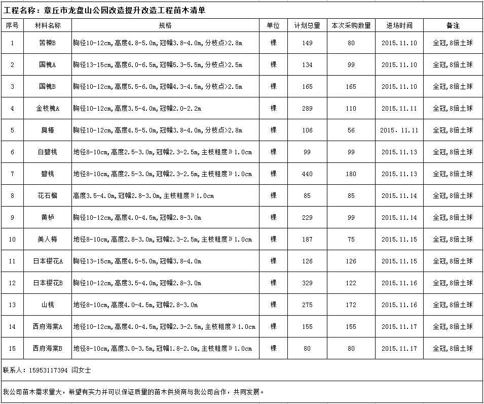 章丘市龍盤山公園改造提升改造工程苗木清單